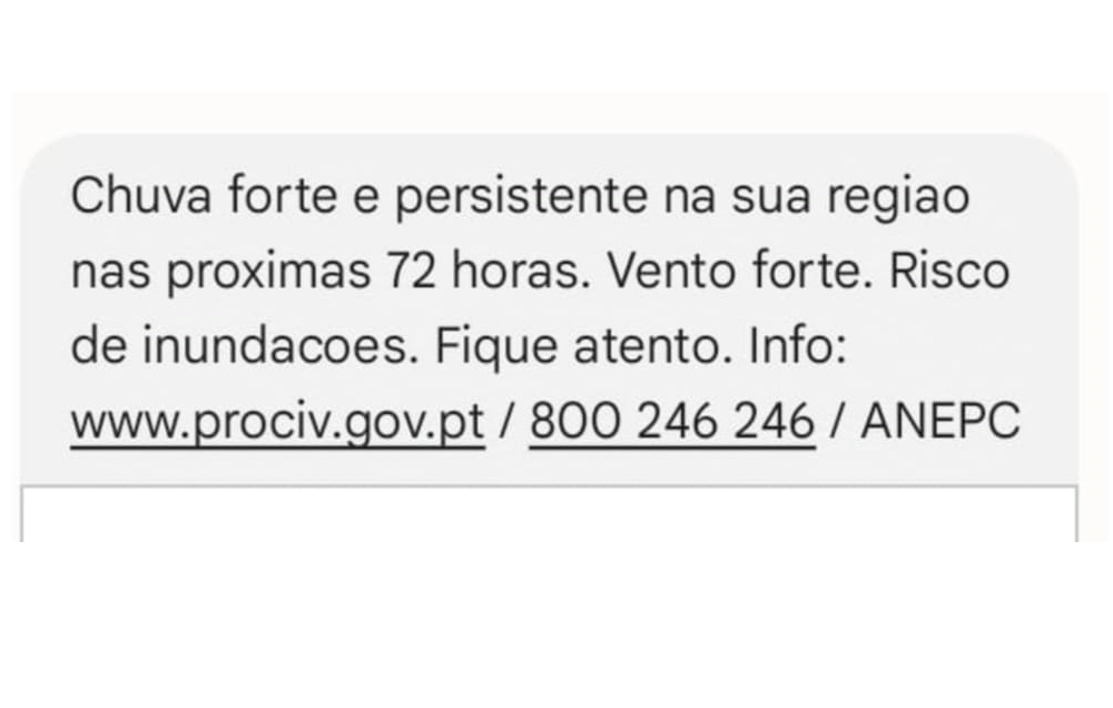 A Autoridade Nacional de Emergência e Proteção Civil (ANEPC) enviou esta terça-feira à população uma mensagem, via telemóvel, onde alerta para “chuva forte e persistente, vento forte e risco de inundações nas próximas 72 horas”.