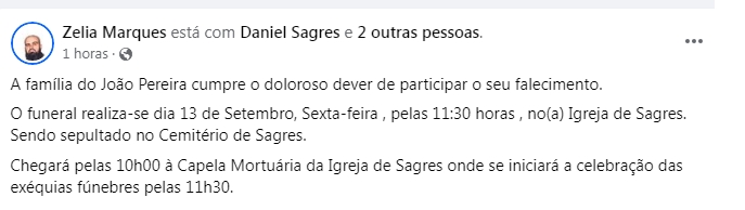 O funeral vai realizar-se esta sexta-feira, dia 13 de setembro, às 11h30, na Igreja de Sagres, distrito de Faro, no Algarve.
