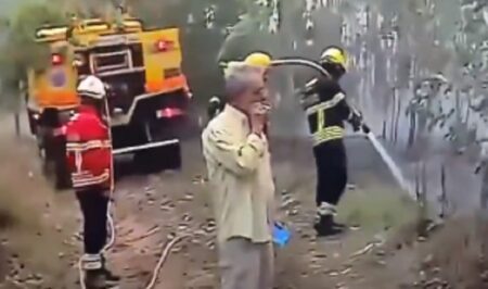 Imagens mostram indivíduo a descartar cigarro junto a vários bombeiros que combatiam foco de incêndio.