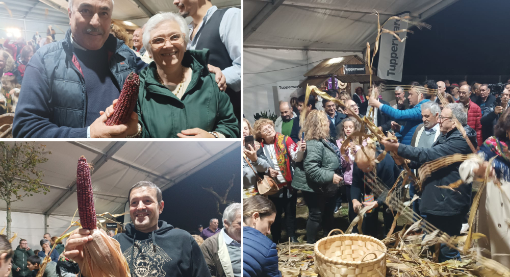 À entrada da tenda, são muitos os que aplaudem a chegada do desfile com o carro de bois carregado de milho pronto a ser desfolhado.