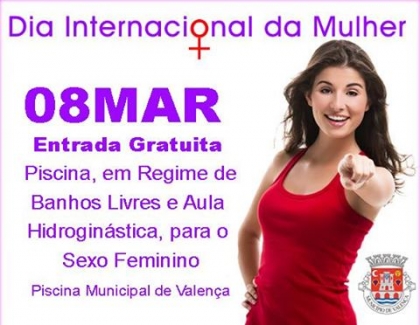 Esta quarta-feira a Piscina Municipal é toda delas. Como forma de assinalar o Dia Internacional da Mulher, aquele espaço tem entrada gratuita a todas as mulheres. Há aulas de hidroginástica também grátis para o sexo feminino. A iniciativa é promovida pelo Município de Valença.