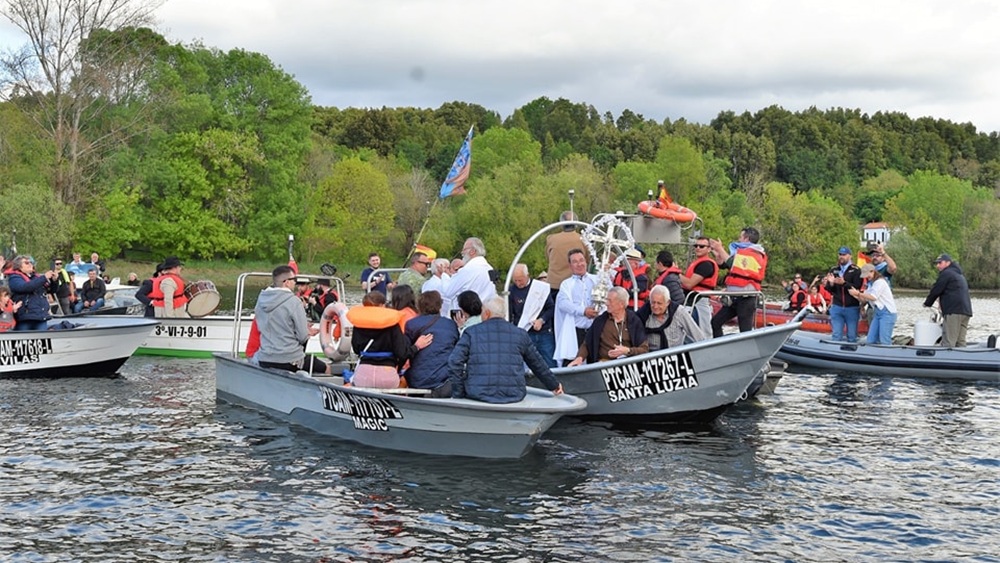 Várias embarcações portuguesas e galegas acompanham este compasso pascal, numa autêntica procissão fluvial, nas águas do Minho.