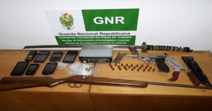 A GNR de Viana do Castelo deteve anteontem, em Valença, dois homens suspeitos de tráfico de droga. Durante a operação, as autoridades realizaram duas buscas domiciliárias e uma a um estabelecimento comercial onde foram apreendidos sete telemóveis, uma pistola, 50 munições, uma faca de mato, sacos de embalamento, duas doses de cannabis, um punhal, um sabre, uma espingarda, e um auto radio.