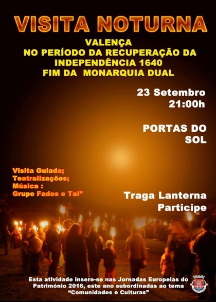 O Município de Valença promove no próximo dia 23 de setembro uma visita noturna pela cidade intitulada “Valença no período da recuperação da Independência – 1640 fim da Monarquia Dual”. A atividade insere-se nas Jornadas Europeias do Património 2016, este ano subordinadas ao tema “Comunidades e Culturas”.