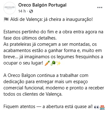 “A Oreco Balgon continua a trabalhar com dedicação para entregar mais um espaço comercial funcional, moderno e pronto a receber todos os clientes de Valença. Fiquem atentos — a abertura está quase aí!”, acrescenta.