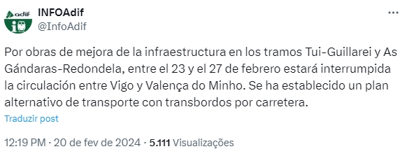 Em nota divulgada nas redes sociais, a operadora espanhola Adif informa que “devido a obras de melhoria nos troços Tui-Guillarei e As Gándaras-Redondela, a circulação entre Vigo e Valença do Minho vai ser interrompida entre 23 e 27 de fevereiro”.