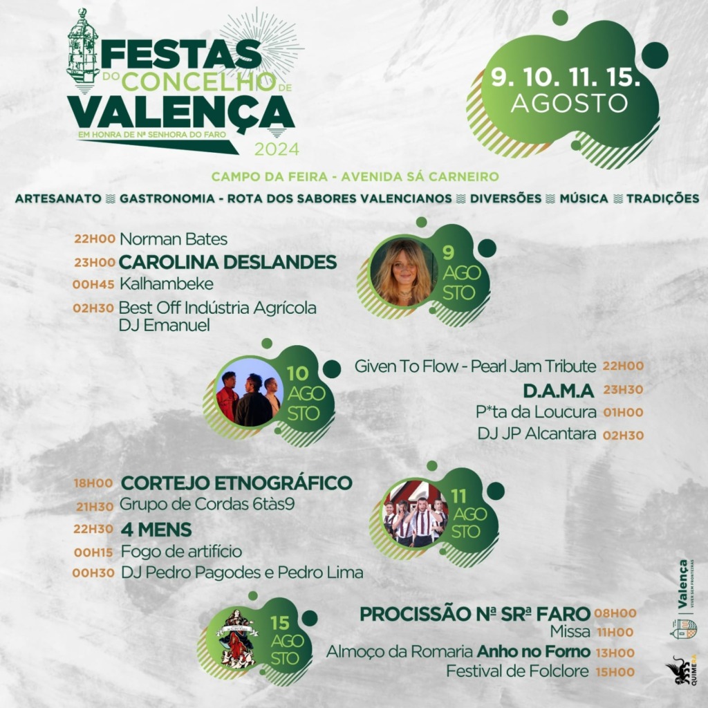 As Festas do Concelho de Valença, em Honra à Nª Srª do Faro, começam no próximo dia 9 de agosto. Entre outros nomes, vão passar pelo palco do Campo da Feira Carolina Deslandes e DAMA.
