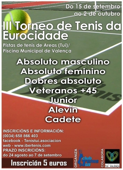 Neste III Torneio de Ténis da Eurocidade, as competições vão decorrer nos courts de ténis da Piscina de Valença e nos courts das Pistas de Tenis de Areas, em Tui. A final do torneio está marcada para 2 de outubro.