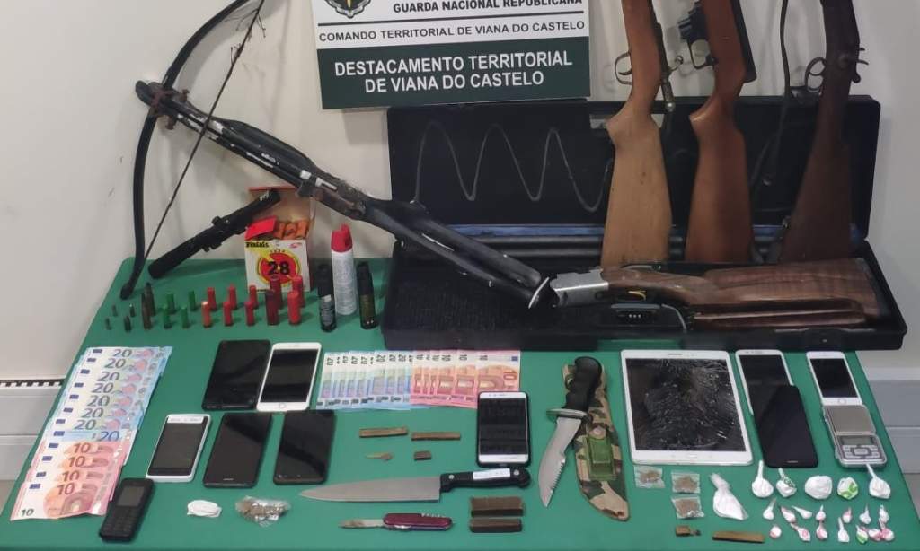 Foram apreendidas 237 doses de cocaína; 110 doses de haxixe; uma balança de precisão; duas facas utilizadas para cortar o produto estupefaciente; duas caçadeiras; duas carabinas; 45 munições de diversos calibres; três aerossóis de defesa – gás pimenta; uma besta; uma mira telescópica; 10 telemóveis e um tablet; 460 euros em numerário.