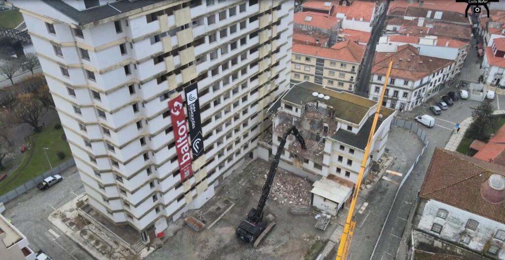 Arrancou a demolição do prédio Coutinho, em Viana do Castelo. Mais de 20 anos depois, com desconstrução prevista desde 2000, uma máquina giratória, com um braço que atinge 40 metros de altura, equipamento “único em Portugal”, já começou a fazer a desconstrução “pesada”, piso a piso, dos 13 andares do prédio Coutinho, em Viana do Castelo.